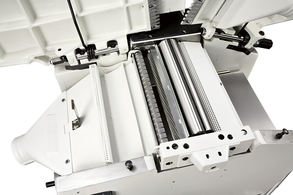A unidade de plaina está montada sobre suportes de ferro fundido e, na versão padrão, possui um bloco de corte com 87 mm de diâmetro e 3 facas. (O bloco de corte "Tersa" opcional está disponível com 4 facas de aperto rápido e ajuste automático). Para um acabamento impecável, a pressão dos rolos de alimentação da desengrossadeira pode ser ajustada de acordo com o tipo de madeira trabalhada. O rolo de entrada possui um perfil helicoidal para garantir um avanço firme e constante da peça, enquanto o rolo de saída, em aço jateado, mantém o acabamento perfeito após o processamento.