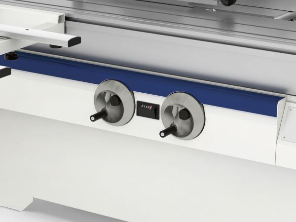 Os volantes na frente da máquina, para o movimento da unidade da lâmina de serra, são fáceis de usar; Cada movimento mínimo do volante corresponde a um ajuste exato da lâmina.